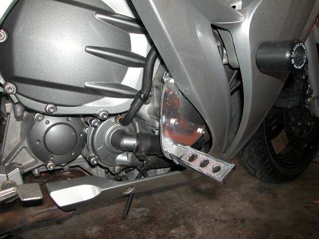 Pricing will vary depending on what choices you make. I would seriously consider a peg that supports extensions so you don't have to reach around the lower fairing. The Kuryakyn (footpegs) designs allow the extension to fold near the bracket so that the peg and extension will fold up next to the bike. Some Kuryakyn designs even have "dog leg" brackets that can accommodate those with longer legs. Other designs fold the peg at the end of the extension; leaving the extension sticking out farther (from the side of the bike) which might make the pegs drag early in a curve or subject the pegs/engine to damage durring a tip over. Keep in mind that the example photos shown here are the polished brackets that Bill decided not to produce. I got one of the few prototypes that he made with a polished finish. All brackets now come in a bead-blasted finish, include stainless steel screws and installation instructions. The bead blasted finish doesn't spot like the polished ones show in these photos.