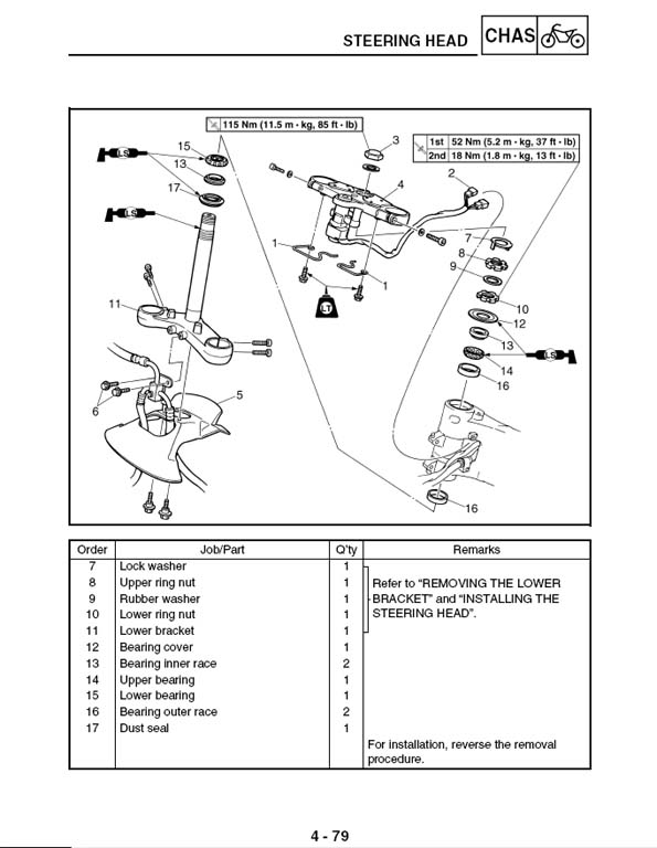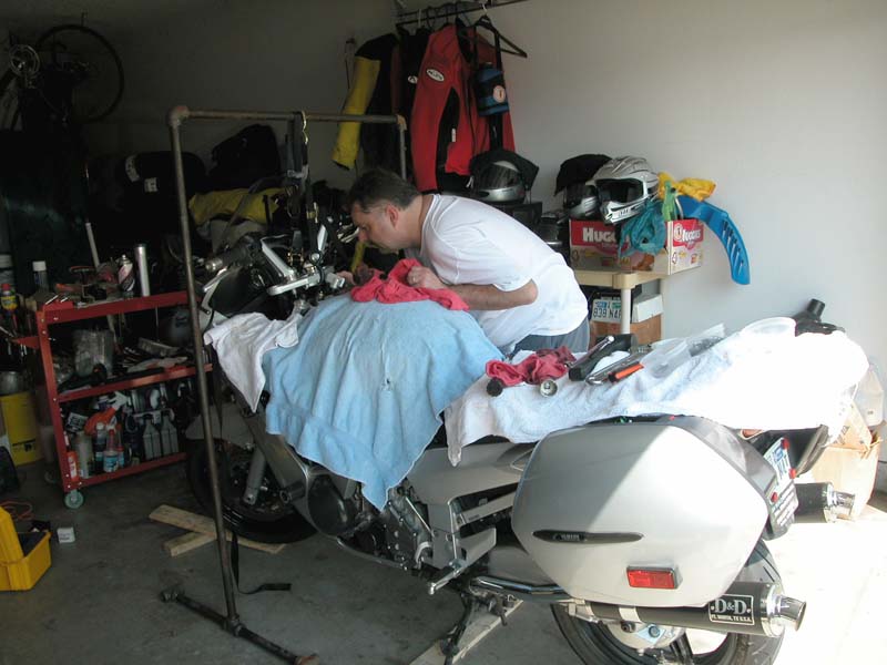 | Steering Head Bearing Service The Yamaha factory service manual calls for servicing the steering head bearings every 12,000 miles or 18 months. At 23,000 miles and 22 months, this second service was a little early. Jim Fortner hosted this wrenching session at his house in Plano. When I arrived, he was putting his bike back together after R&R his steering head bearings. I had the torque wrench and spanner.