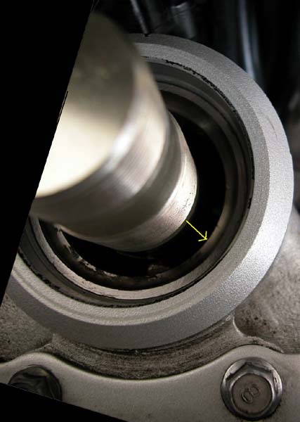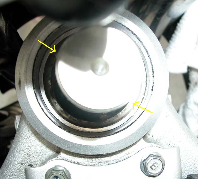 Everything went by the book for both bikes. According to pages 3-59 through 3-61 of the 2003 Factory Service manual. Since this is just a service, the inner races were not removed. If, during inspection, parts of the lower assembly or the outer race of the upper assembly needs replacement, you'll need to drop the fork assembly (along with the associated tasks of dealing with the brake lines, removing the old races, installing the new races, etc.). However, access to the upper bearing components for replacment is possible without further disassembly. It took about an hour and a half from the time we pulled it in to the time we backed it out. Since this was it's first bearing service, we were glad to see that Jim's 2004 assembly showed signs of being well-packed from the factory. My 2003 had already been serviced at 12,000 miles. It was clear that the shop doing the first service didn't have the spanner and had used either a flat bladed screw driver or chisel to tighten the lower ring nut. During the inspections, all the components on Jim's bike looked like new while my 2003 (2,000 fewer miles but 1 year older) had an upper, outer race that showed signs of the plating wearing off. All the other components (bearings, seals, etc.) still looked great. Since the races I had ordered hadn't arrived we reassembled everything appropriately. I'll plan on a complete dissassembly and replacement at the next service since there was no indication of rust, denting, or other damage. If I had the parts or if I had the bike apart at home, I'd have replaced the outer race before reassembly even if it meant waiting for the part to arrive.