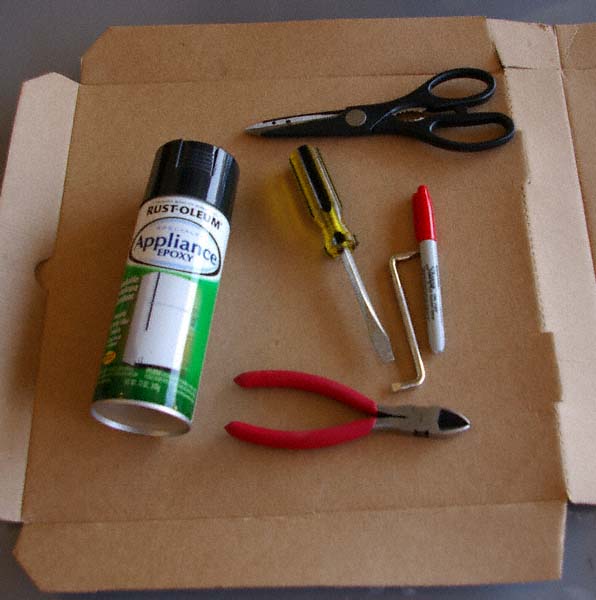 Above: Stiff cardboard for cutting a pattern. Flat blade screw driver to removed the platic rivets holding the scoop insert in place. Dog-leg flat blade in case some rivets are hard to reach under the sound deadening cover on the underside of the hood. A marker to draw the pattern. Diagonal cutters (dikes) to cut the aluminum mesh.