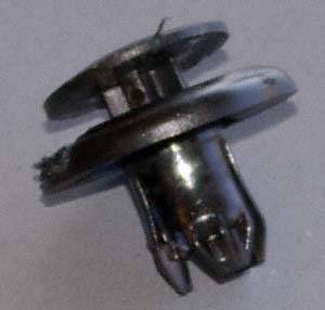 Remove the scoop insert from the hood by removing the 15 plastic rivets (above) that hold it in place. The inner pin of the rivet locks the outer collar in place. You have to insert a flat-blade screw driver into the knotch in the collar and twist the screw driver to pop up the inner pin. If you try to pry the pin up from the collar (or the collar and pin up together as a unit) the rivet will break. Extras are available through your Subaru dealership if you break or lose any during your project. I need 4.